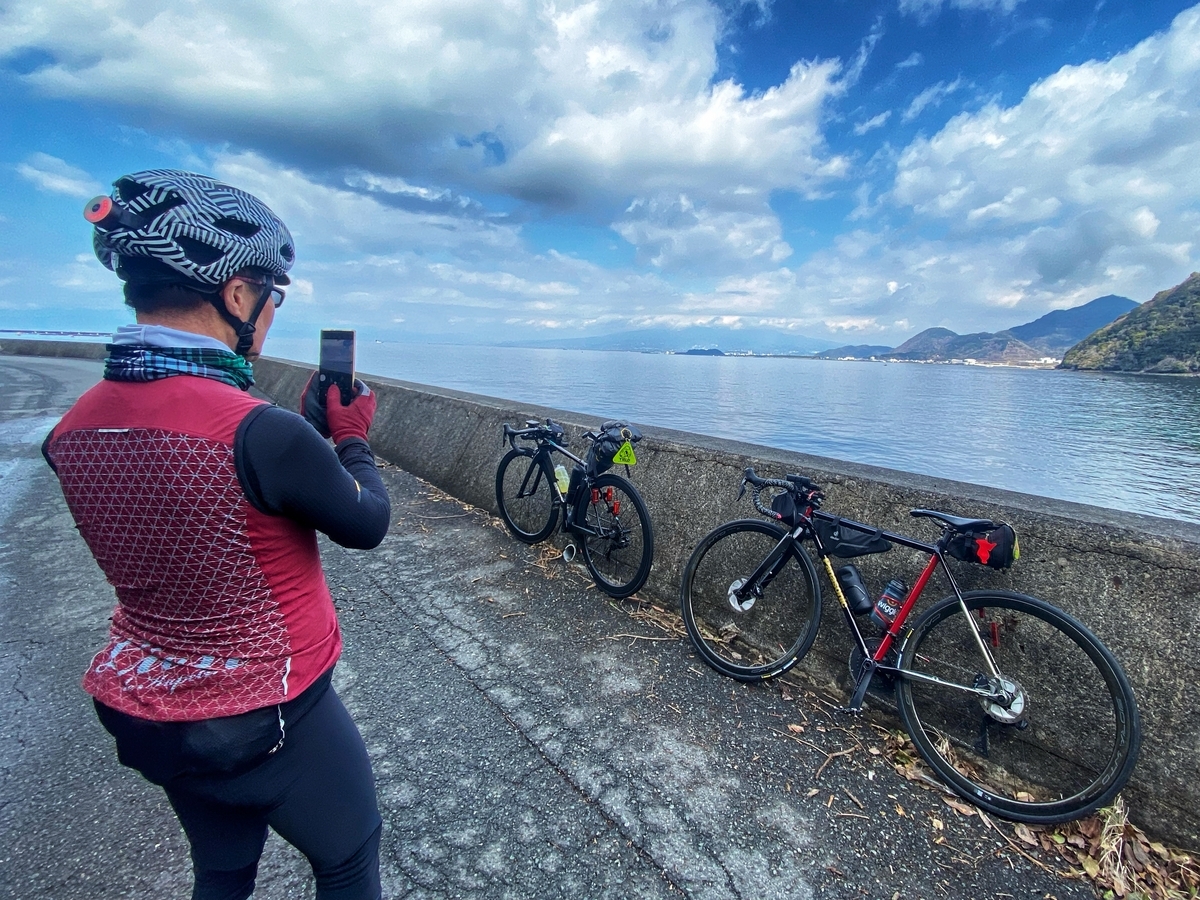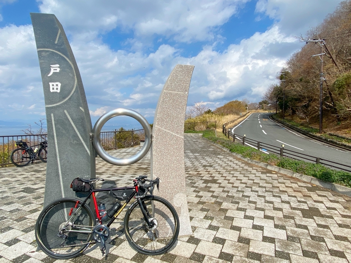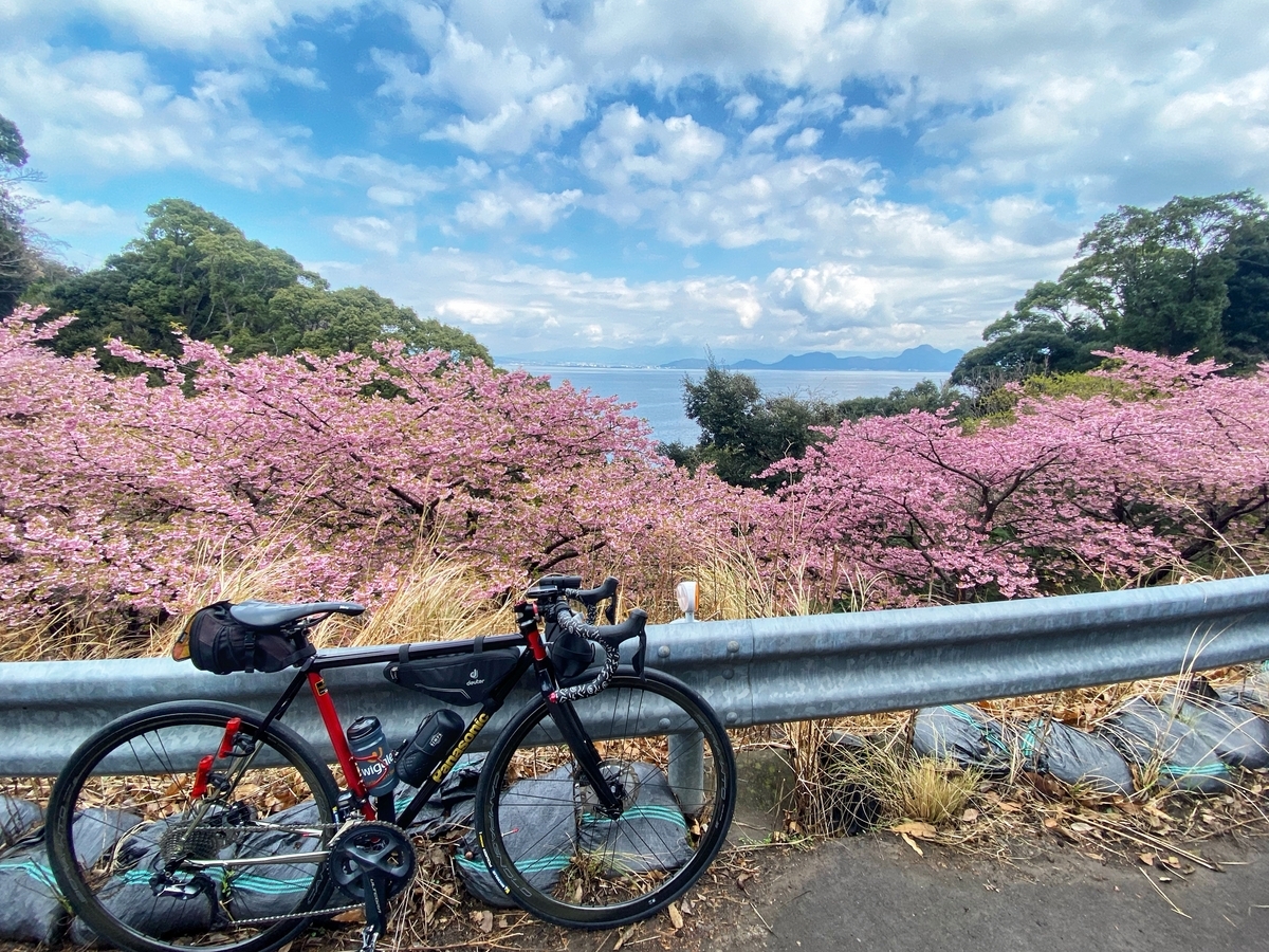 戸田の山を越える途中で、河津桜を発見。ちょうど今が見頃ですね*2。このあたりで1袋(5個入り?)100円のみかんが売られていて、非常に美味しそうだったのですが、、、みかんを担いでヒルクライムは厳しいので、泣く泣く断念。