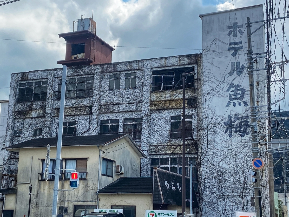 戸田港に降りてきたところで、廃ホテルを発見。同行のぶりおにーるさんが「ほら、あそこに廃ホテルがありますよ!」と教えてくれたのですが、廃道好きが必ずしも廃墟好きとは限らないんですよ(笑)*3