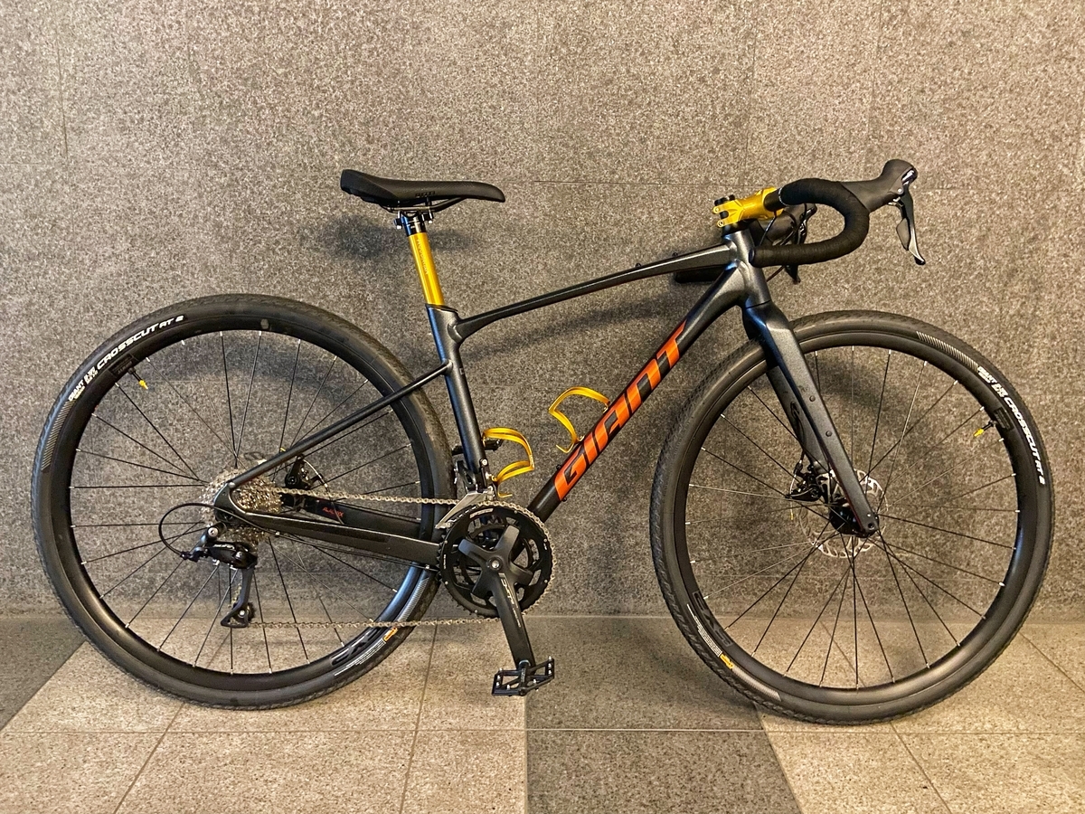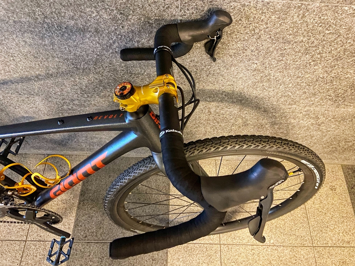 目立つパーツとしては、ハンドルバーを純正(349g)からDIXNAのBANDY 2(289g)に交換。ブラケット部分が385mmと狭くなったので、舗装路で乗りやすくなりました(フレア形状なので、未舗装路では470mmの下ハンドルを活用します) ハンドルバーのリーチが15mm短くなった分、ステムを純正の50mm(106g)からMORTOPの70mm(93g)に伸ばしました。バーテープ は、OGK Kabutoの極厚(4mm)*1