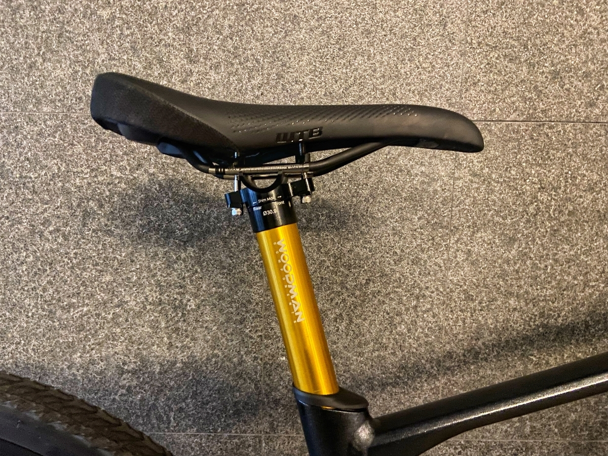ステムに合わせて、シートポストも純正(356g)からWOODMAN(187g)のゴールドに交換。サドルは、純正(309g)からWTB VOLTのチタンレール(233g)に交換。