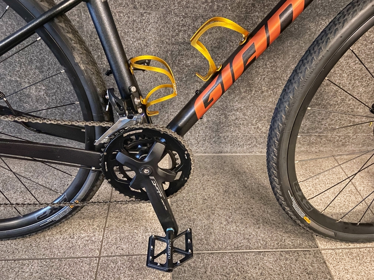 そして、ボトルケージは、LITEPROのゴールド(20g×2)を装着。ペダルも、完成車についていたWELLGO(309g)からLITEPRO(171g)に交換。