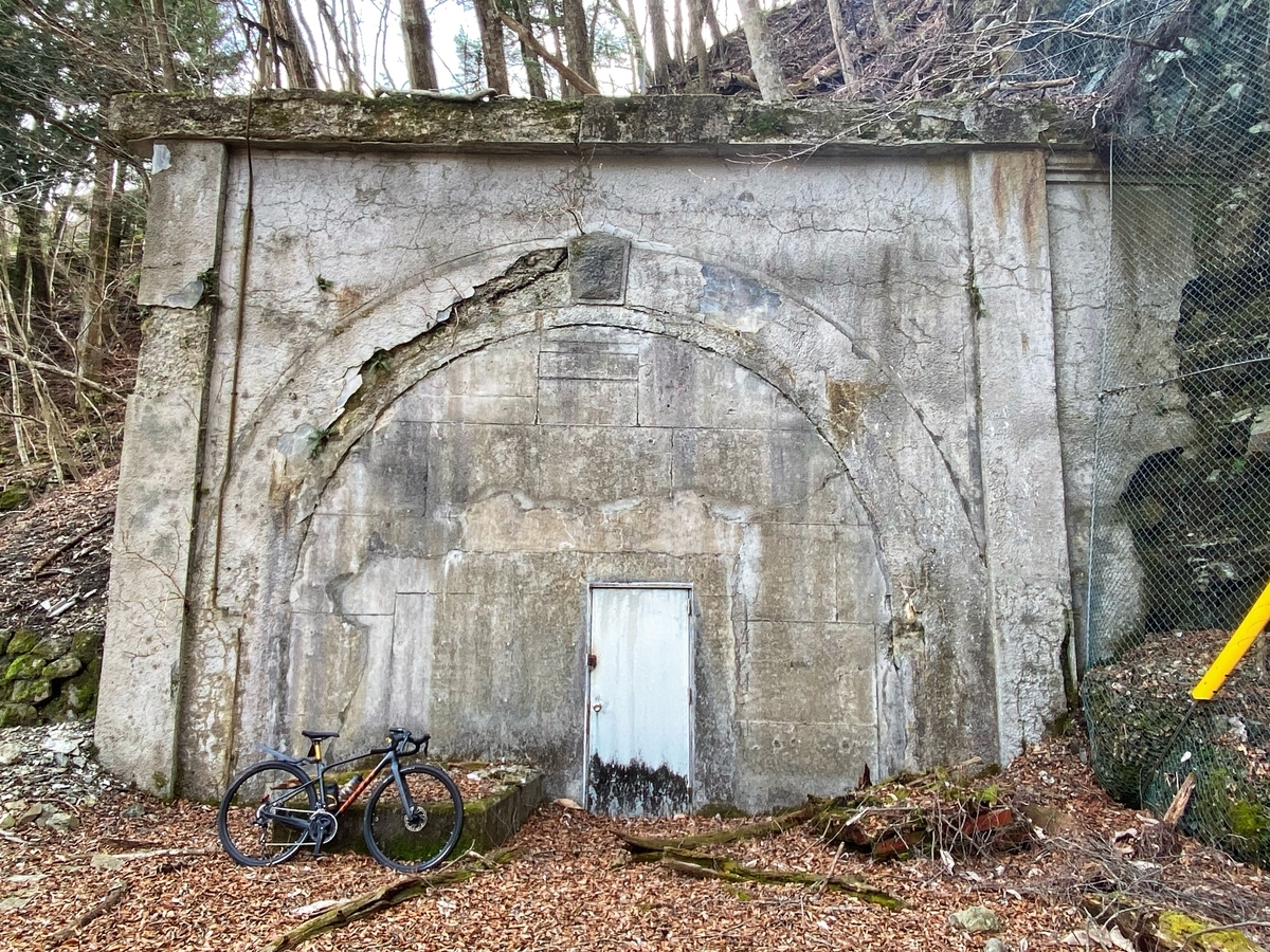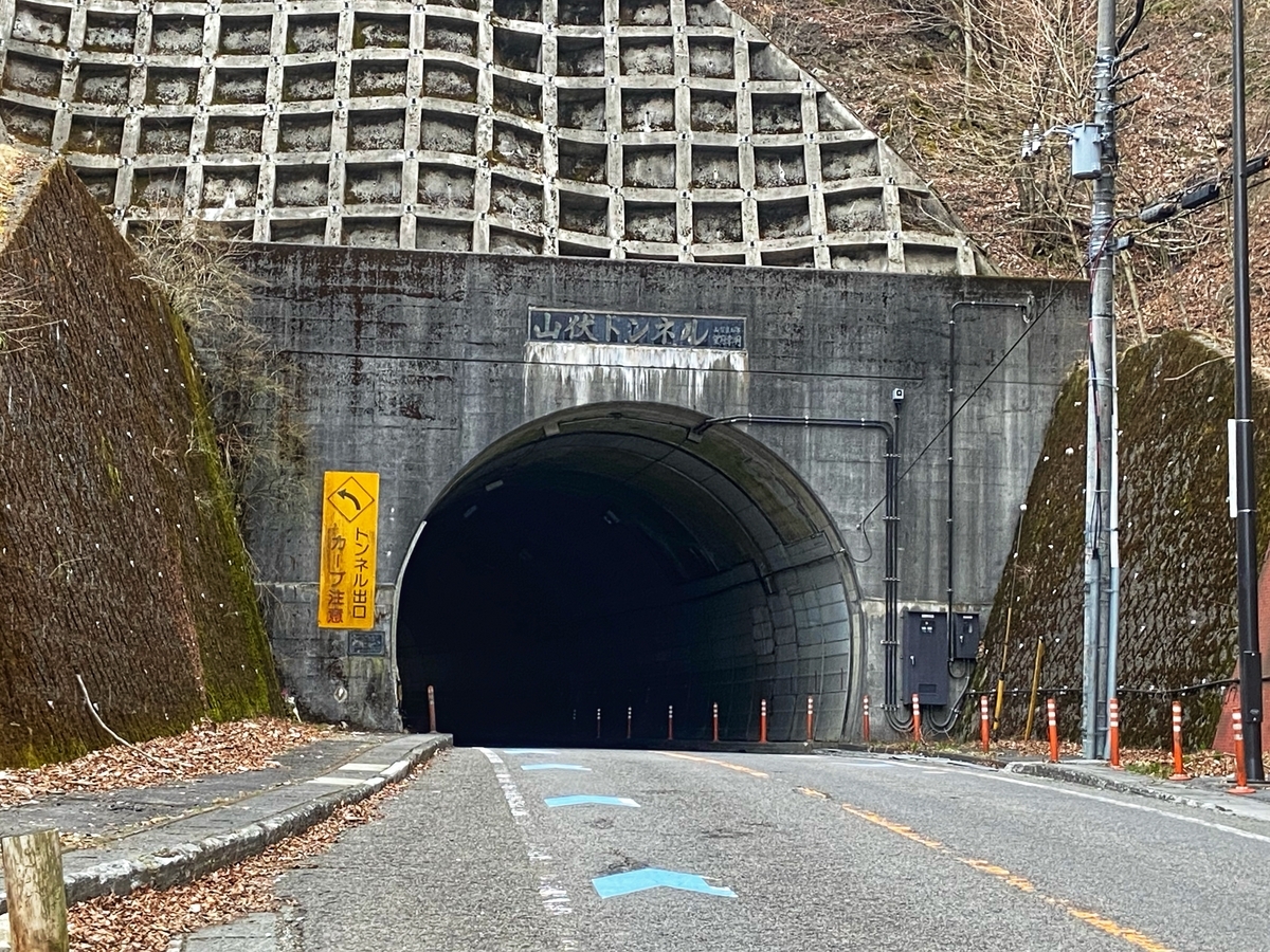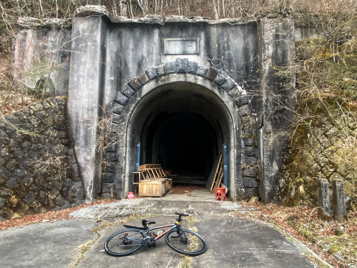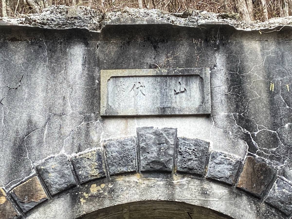すぐに山伏隧道とご対面。1932(昭和7)年竣工、延長125m、幅員2.9m、高さ3mで、1982(昭和57)年3月に山伏トンネルの竣工にともなって廃止されたそうです*5。隧道の中は恐らく私有地なので、外から眺めるだけにしましょう。