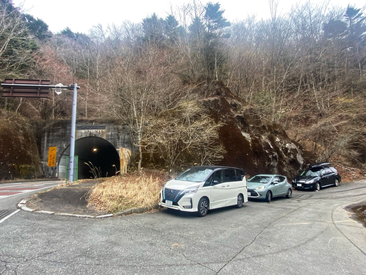 今回の最初の目的地は、山伏トンネルの山中湖側に残る旧隧道です。早速、写真で車が停められている脇道に入っていきます*4。