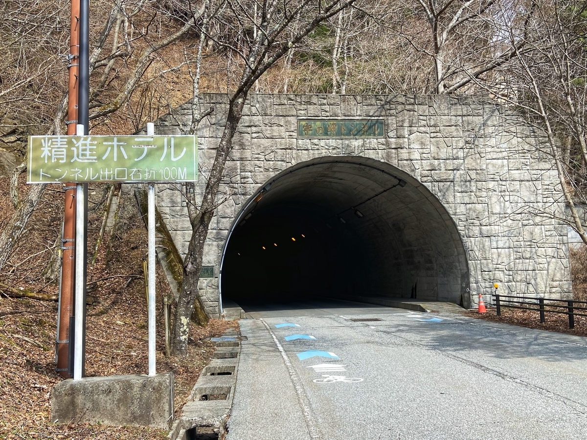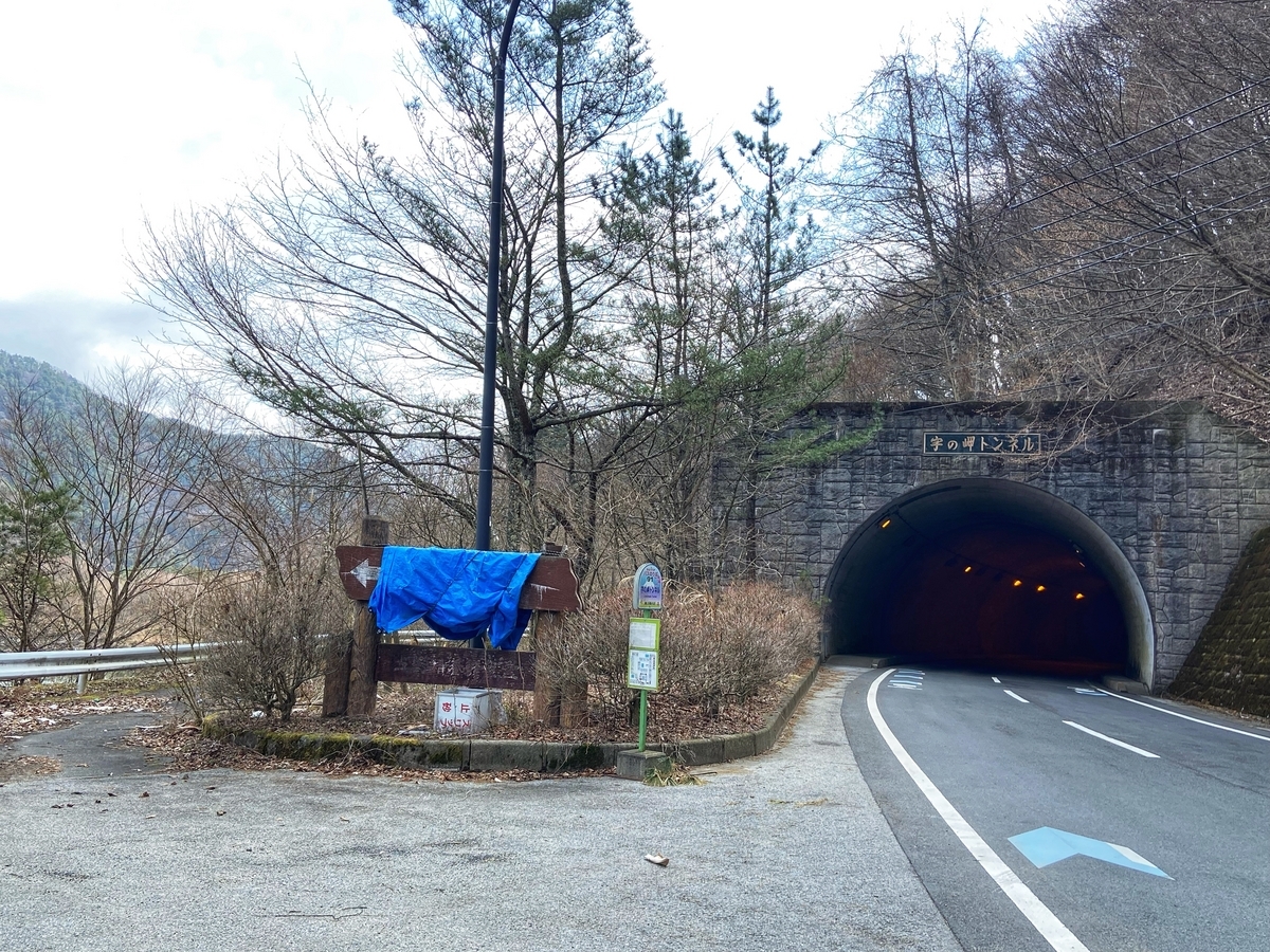 精進湖に行く目的は、湖の西側にある宇の岬トンネルの旧道です。まずは、南側の分岐(赤い三角コーンがあるところ)を入ると、すぐに旧隧道(宇乃岬隧道)があります*8。1954(昭和29)年竣工で、1989(平成元)年3月に宇の岬トンネルの竣工にともなって廃止されたそうです*9。