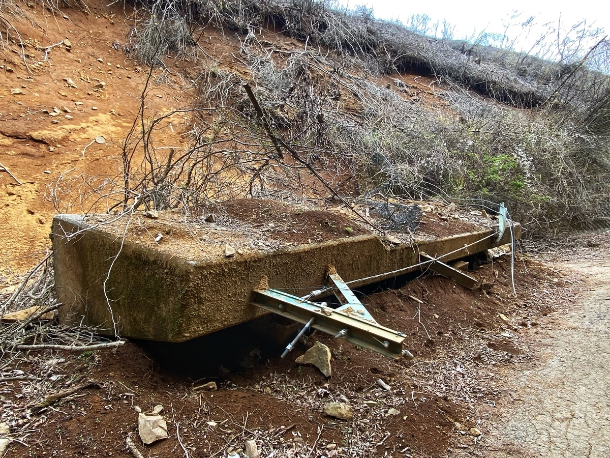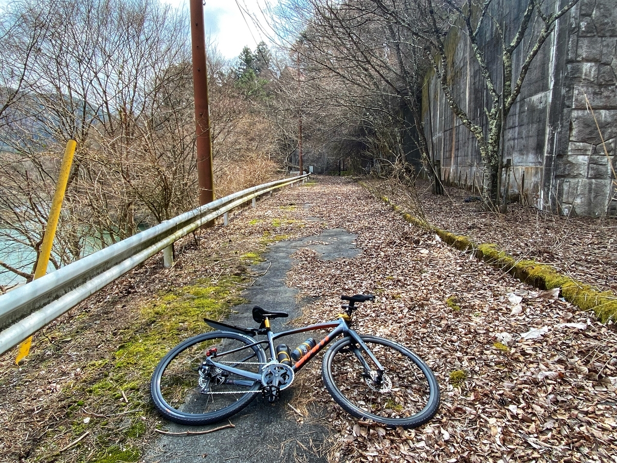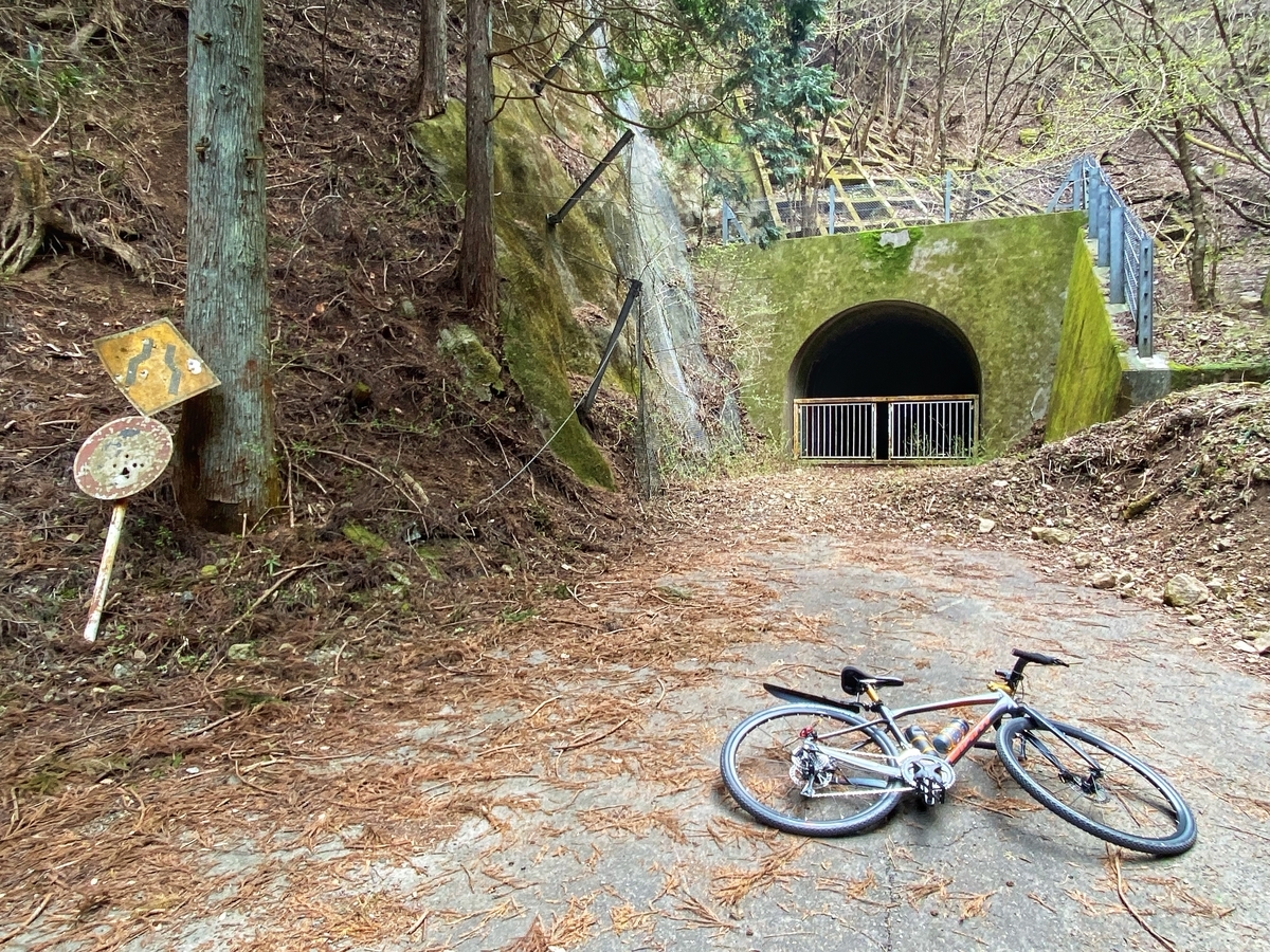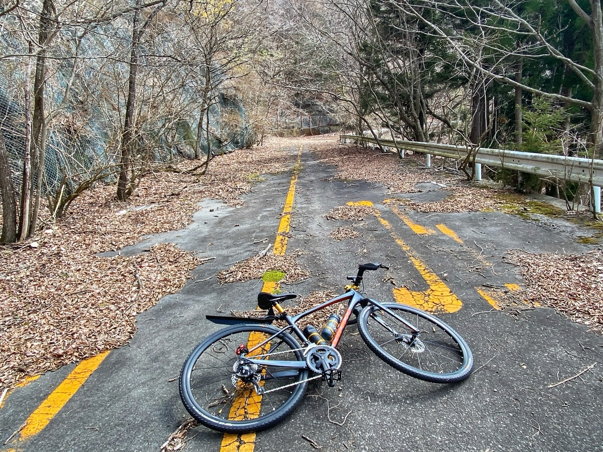 現在は法面工事で通行止めのようですが、たまたま訪問したときは休工中で、通行止めの看板も道の脇に寝かされていた(倒れていた?)ので、その場に自転車を置いて、徒歩で入ってみました。