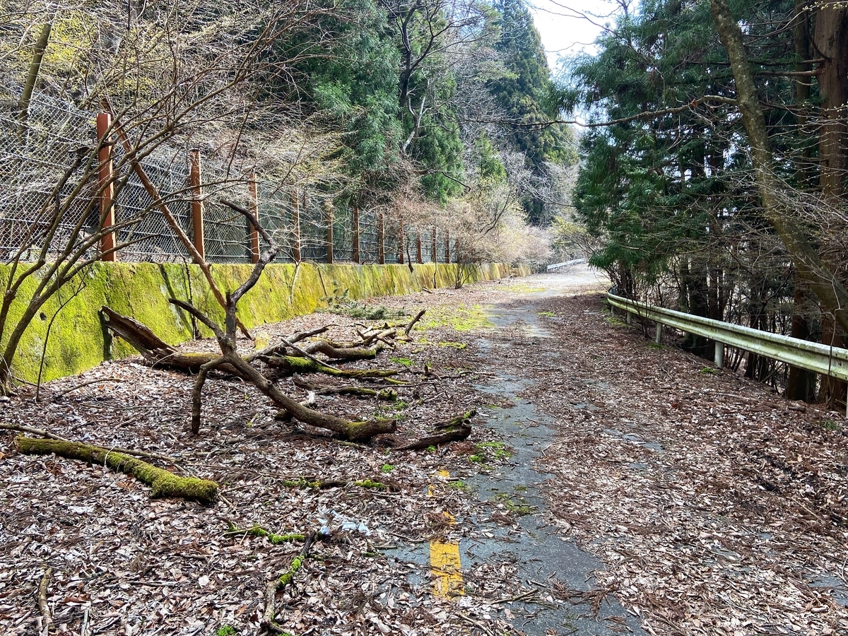 たまたま(?)ガードレールでしか区切られていない区間で気がついたので、サクッと廃道側へ。この廃道は、結構長いです*10。ただし、明らかに道が斜めになっていて、崖側が下がっているので、若干ドキドキします(苦笑)