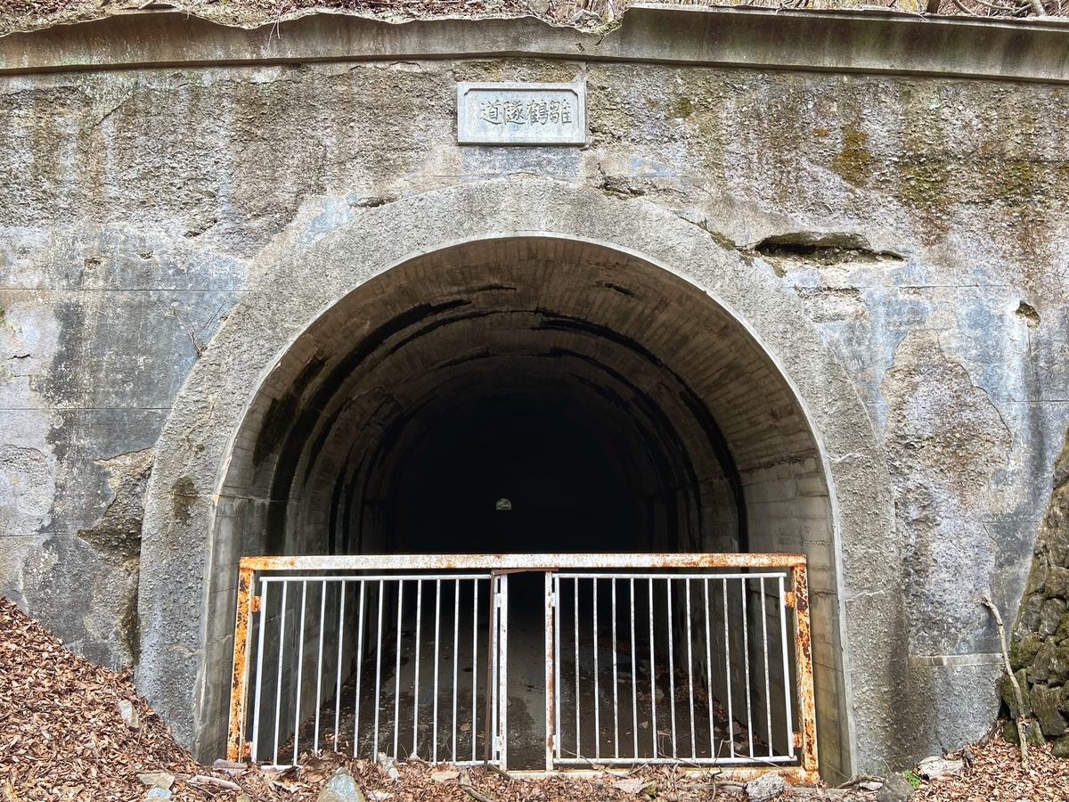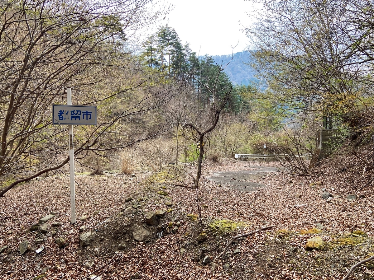 旧雛鶴隧道に到着。1934(昭和9)竣工、延長252m、高さ3.5mで、1986(昭和61)年に現・山伏トンネルの竣工にともなって廃止されたそうです*11。積もった土砂、ひしゃげた標識、もはや存在意義を失った「都留市」の看板。全てが美しいです。私は内部に入りませんでしたが、奥の方は素掘りになっているようです。