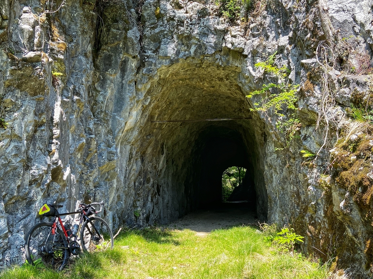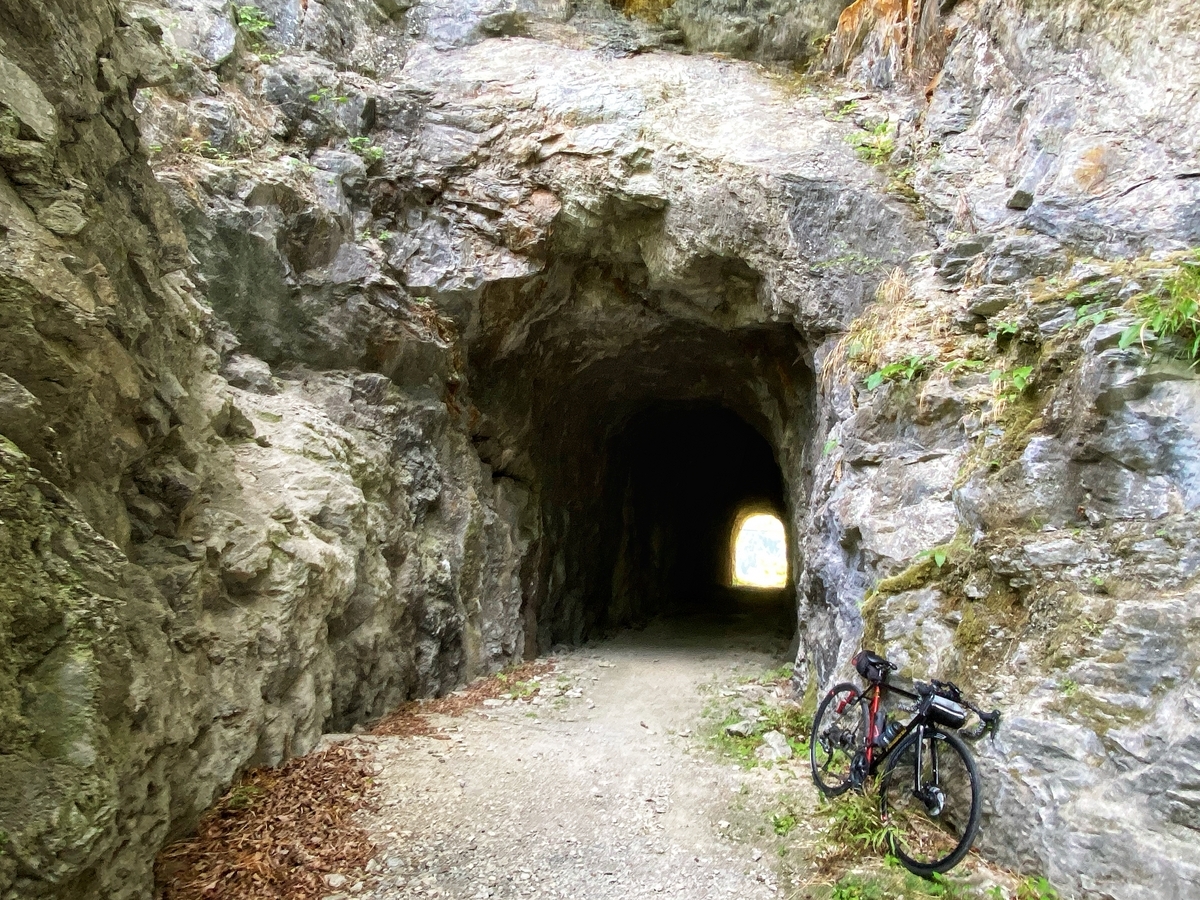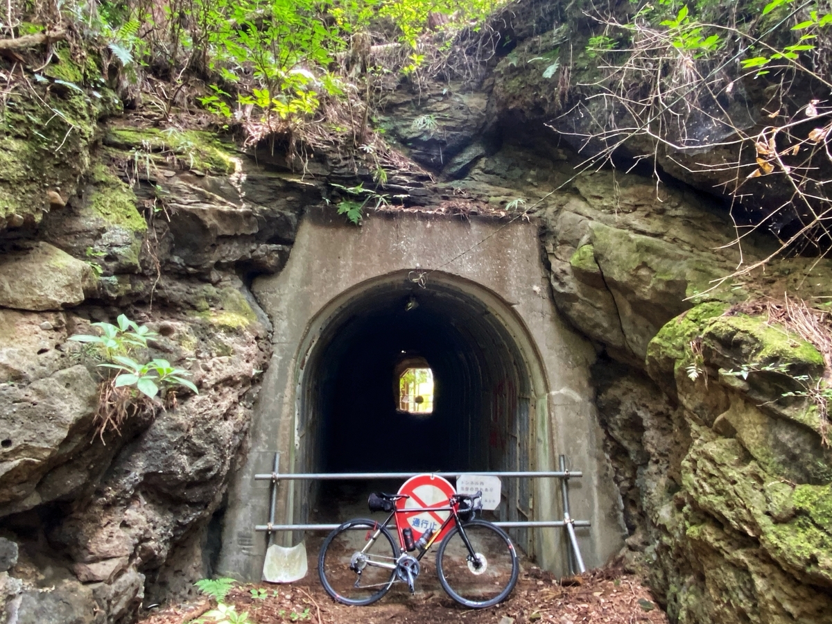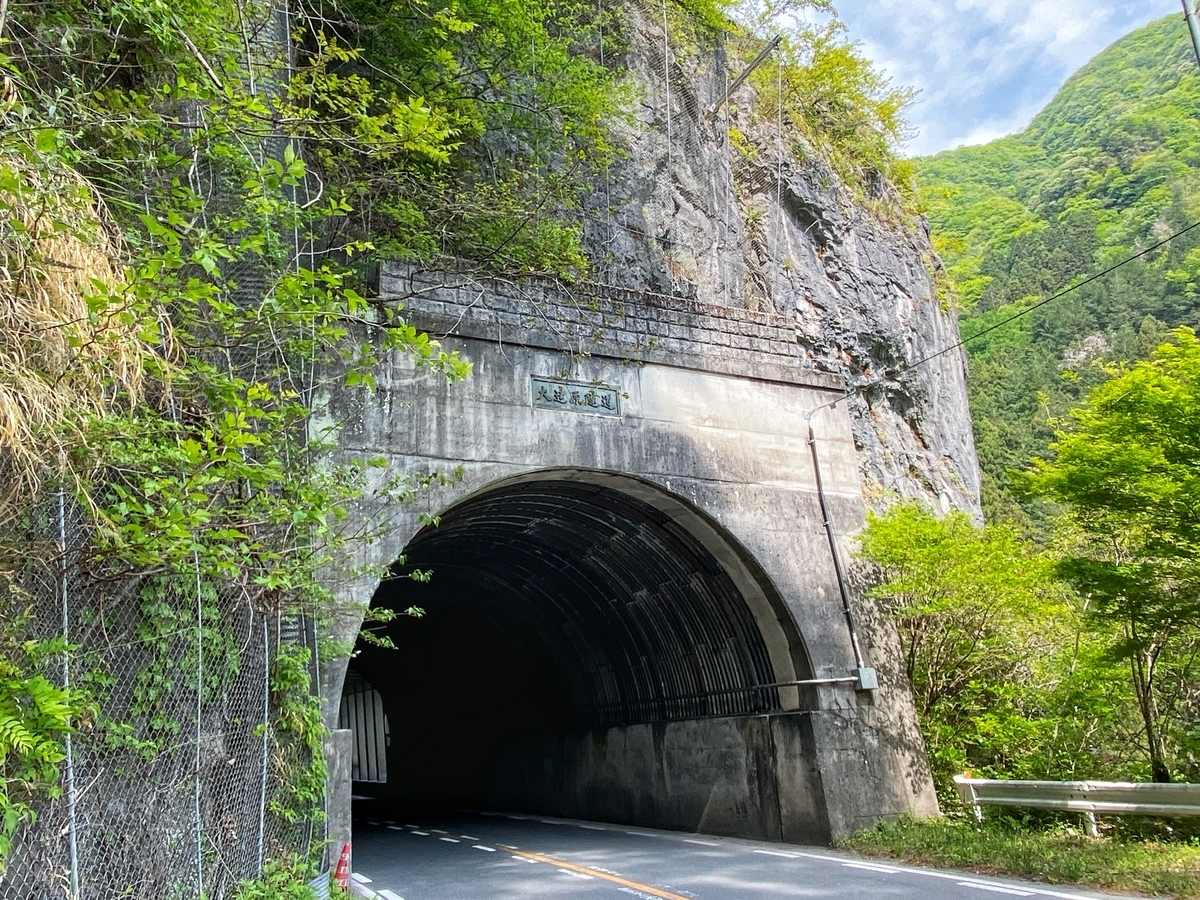 自転車を担いで下界に降りたら、国道140号を秩父方面に切り返します。その道すがら、「大逹原隧道」と名付けられた隧道を発見。反対側(東側)がスノーシェッドになっているため、往路には気がつきませんでした。この隧道と先ほどの素掘り隧道との正確な関係は不明ですが、元々は現道の隧道も素掘りだったようです。このあたりには巨大な片洞門などもあり、走っていて気持ちのいい区間ですね。