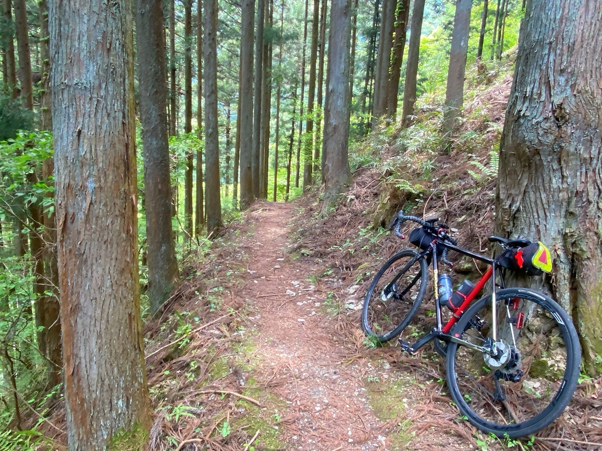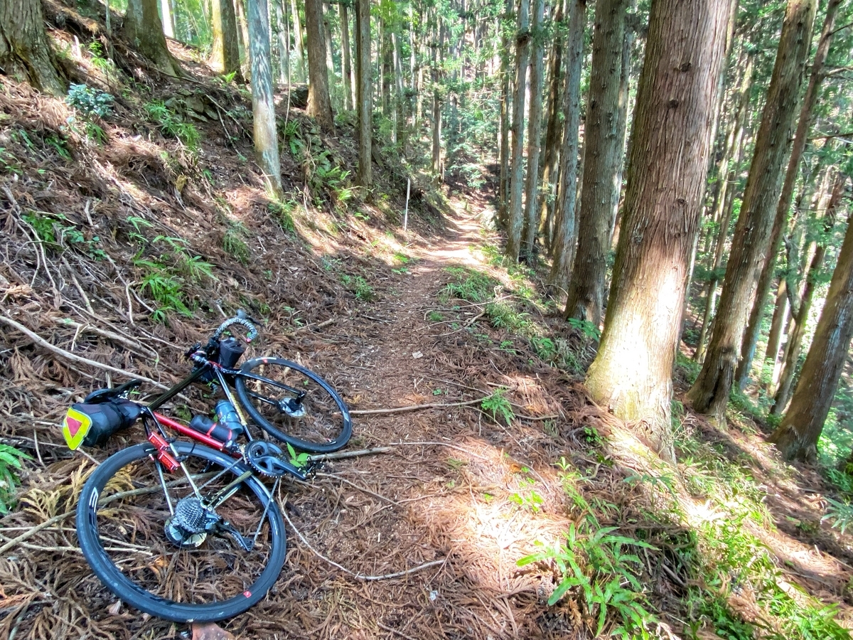 結構な斜度である上、徒歩でも滑りやすい路面なので、自転車から降りて、担ぎに切り替えます。最後の方は(自転車なしであったとしても)歩きにくいので、自転車はキャンプ場に置いてきた方が身のためです(普通の感覚を持った人であれば、初めからそうしている説/苦笑)