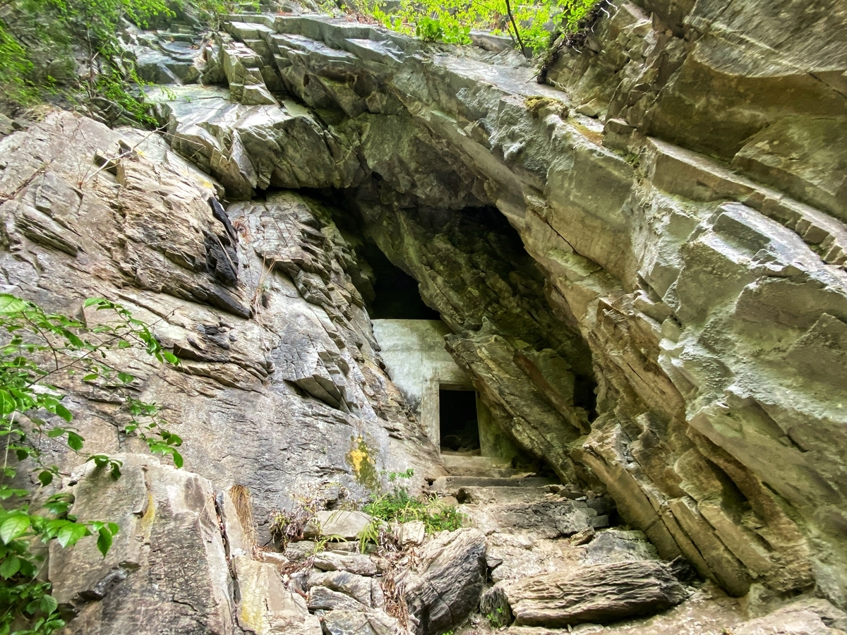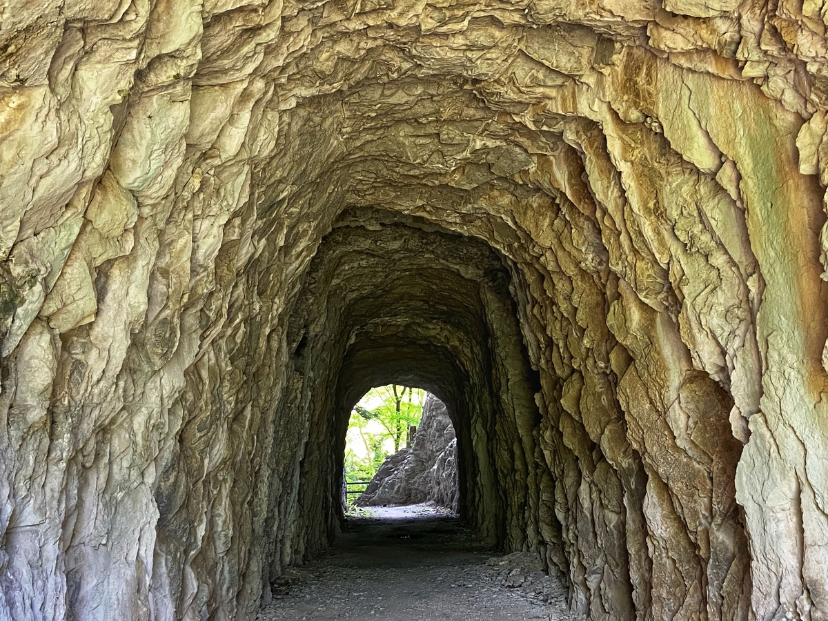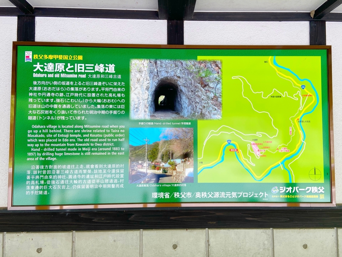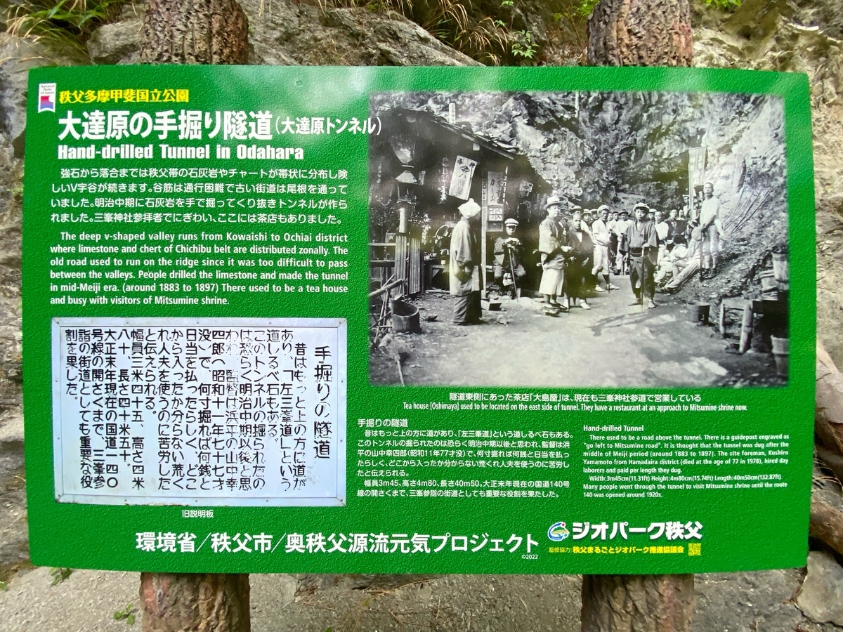 強石から三峯神社へ向かうかつての「三峰街道」には、大達原の手前に、石灰岩をくりぬいたトンネルがあります。(中略)今は人も通らずひっそりとしていますが、大正の初めのころは三峯神社への参拝客で賑わったそうです。大正5年(1916)に秩父を巡検した宮沢賢治も、このトンネルを通って三峯神社へ向かったものと思われます。大正10年、荒川沿いに国道(現在の140号)が開通するまでは参道として重要な役割を果たしました。ちなみに国道も巨大な石灰岩体をくりぬいてトンネルを通しています。(引用元)
