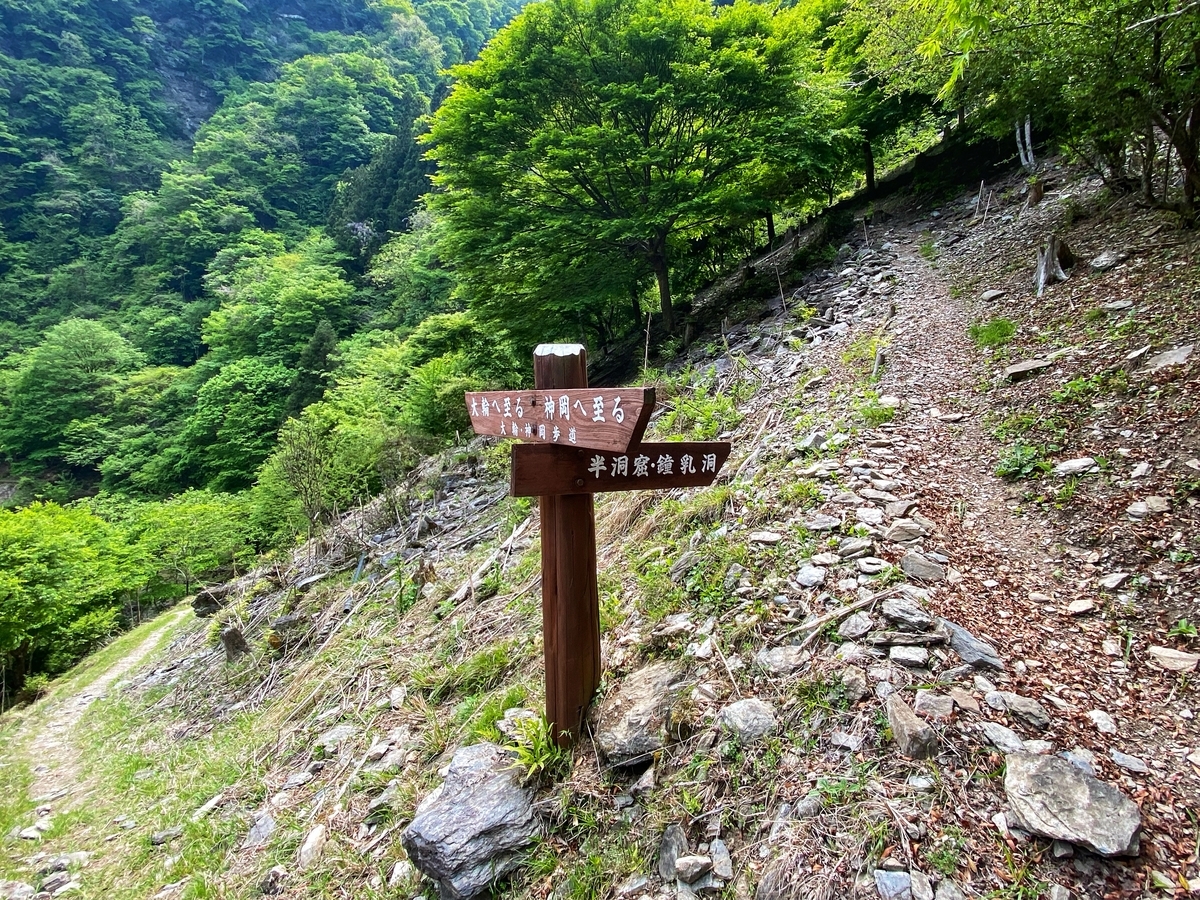 崖沿いのシングルトラック(?)を慎重に進んで行くと、分岐がありました。標識によると、「半洞窟・鍾乳洞」は右らしいです。えっ、右? ここを登るの?
