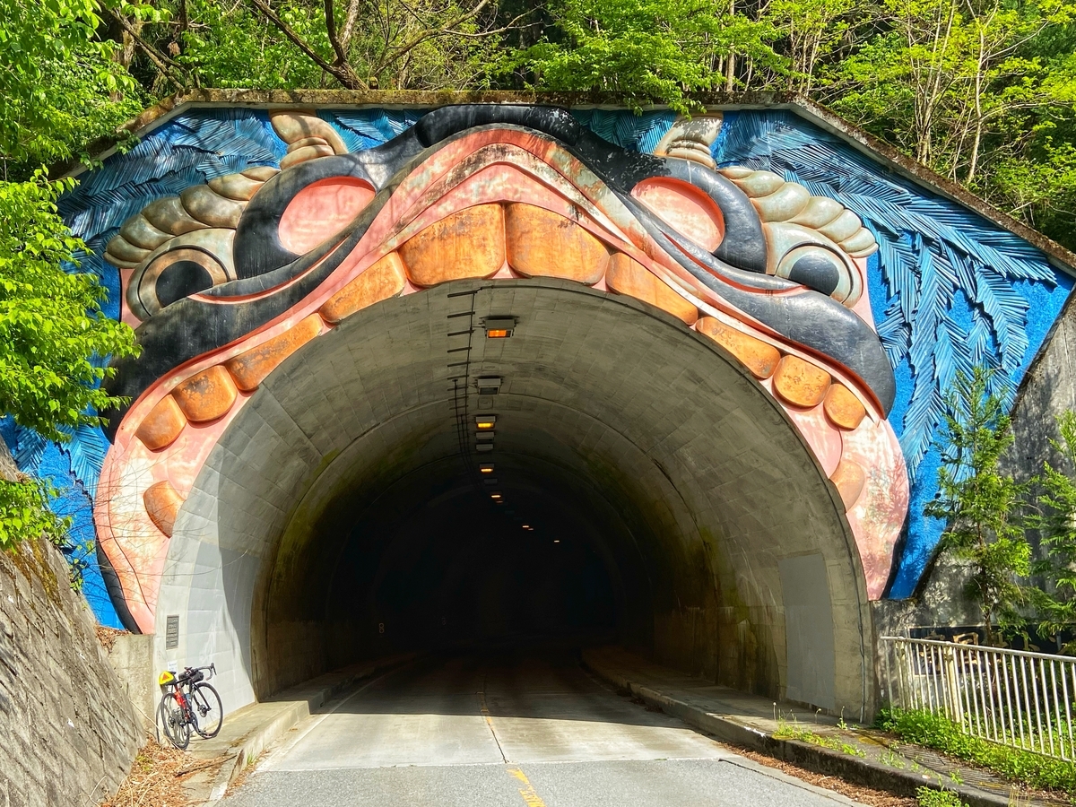 国道140号を浦山ダム付近まで戻ったら*5、久しぶりの廃村探訪*6。このあたりは廃村が多く存在することで有名ですが、今回は、その中で最も有名な岳集落跡に向かいます*7。ダムまで登ったら、何となく寄国土トンネルに立ち寄ります。獅子舞をモチーフにしているそうですが、RPGのラスボスとエンカウントしそうな佇まいです(笑)*8