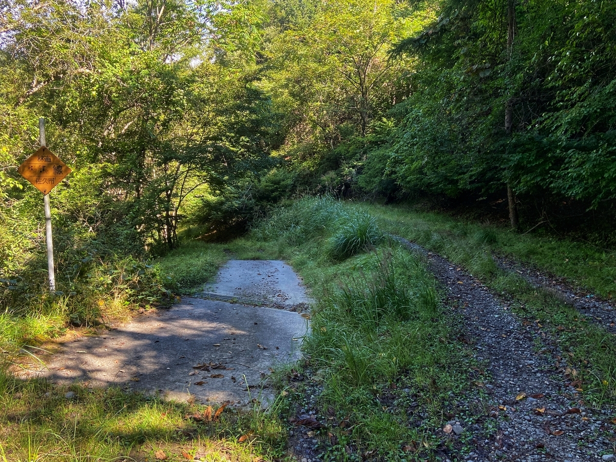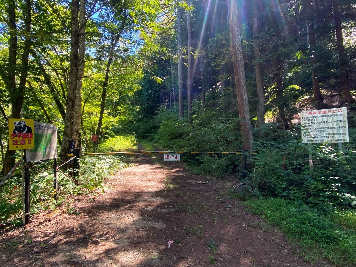 看板の脇にある小さい橋を渡ると、道が左右に分岐しています。左は、日本で海から一番遠い地点に向かう林道滝ヶ沢線ですが、一般車両通行止めです*3。