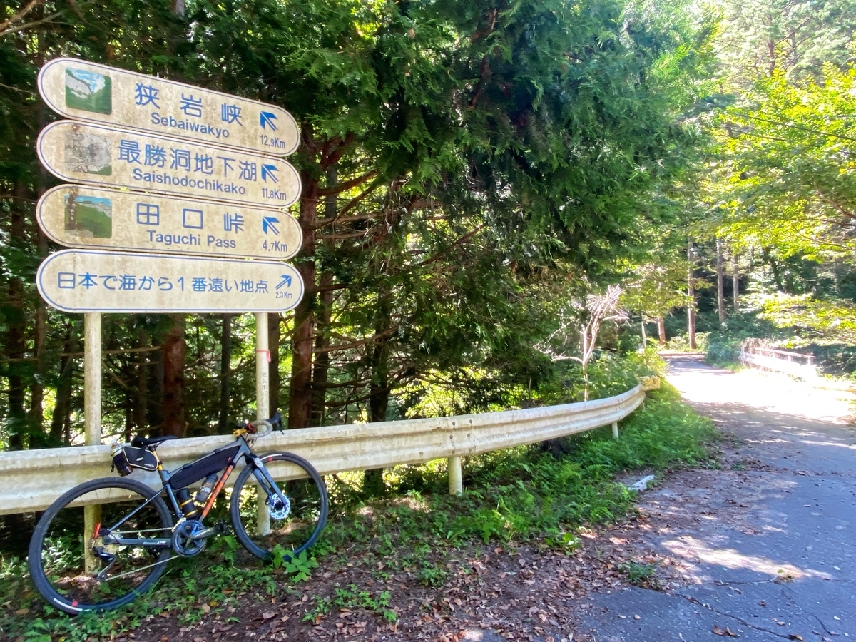 県道93号を1〜2kmほど下ると、「日本で海から一番遠い地点」と看板に書かれた以下の場所に出ます。ここが、次の林道田口十石峠線の入口です。