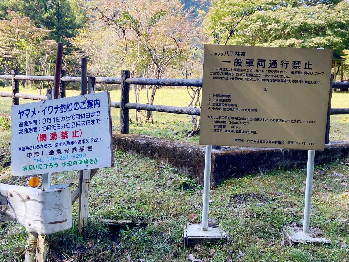 八丁林道を下ったところにあるT字路を右に進むと、林道早戸川線。因みに、左方向は林道荒井線で、がけ崩れで通行止め。