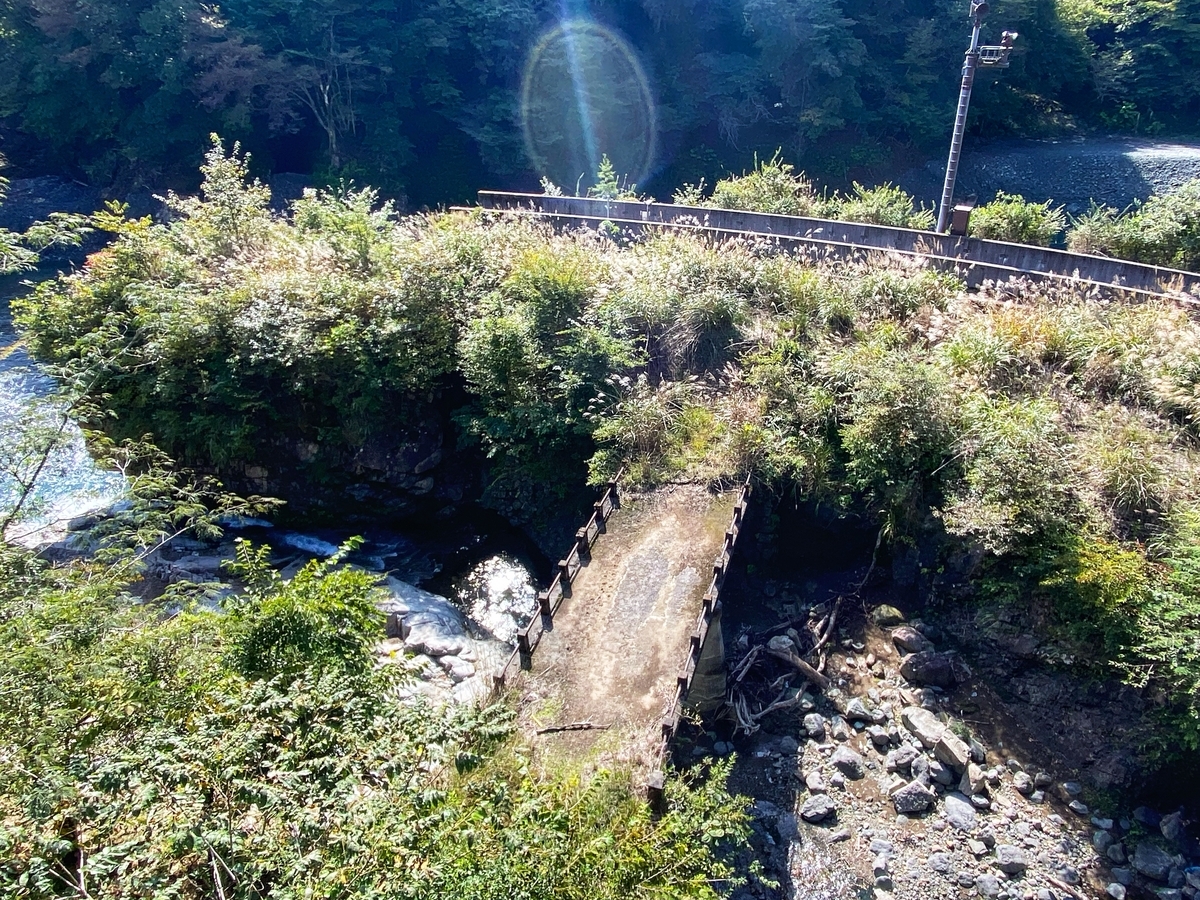 現橋から下に降りるルートは殆ど通行止めで、ゲートが設置されています。ただ、一箇所、まったく封鎖されていない遊歩道(?)があったので、そこから降りることに。