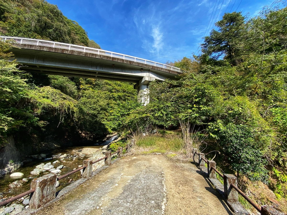 旧橋から現橋を見上げると、以下のような感じ。因みに、ここから八丁林道の旧道(廃道)が続いていて、現在の八丁林道に続いています*5。